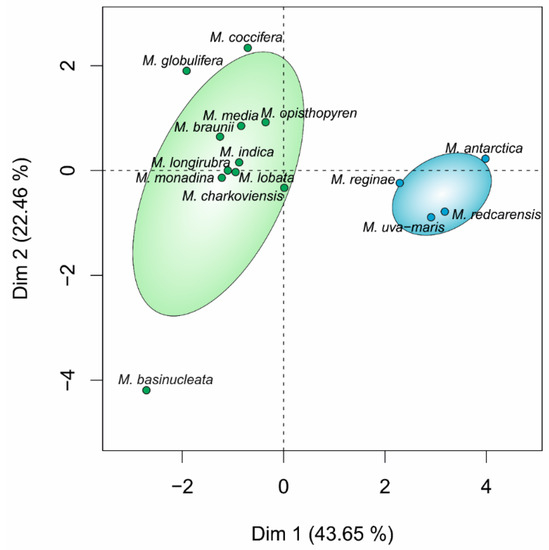 Principal component map showing morphological and ecological dissimilarities between marine (blue) and freshwater (green) Microglena species.