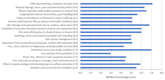 In the first questionnaire, participants were asked to score, on a continuous scale of 0–10, the usefulness of the body of information currently available to undertake assessments of stranded cetacean welfare or survival likelihood, where ‘0 = Not useful at all’ and ‘10 = Very useful’. Participants were subsequently provided with the opportunity to identify, in their own words, the most significant knowledge gaps (i.e., the gaps that, if filled, would improve the ability to assess stranded cetacean welfare or survival likelihood). For each of the major themes arising from the open responses in the first questionnaire, participants were asked to score (as categories in the second questionnaire) their agreement that filling that knowledge gap would improve the ability to assess stranded cetacean welfare or survival likelihood, where ‘0 = Would not improve’ and ‘10 = Would greatly improve’.