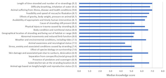 Participants were also asked to score the extent to which knowledge is currently available to assess how each of these categories affects the welfare or survival likelihood of stranded cetaceans with ‘0 = Knowledge is insufficient’, ‘5 = Some knowledge is present’ and ‘10 = Knowledge is complete’. Finally, participants were invited to provide their opinions on any barriers to determining how these categories affect stranded cetacean welfare or survival likelihood.