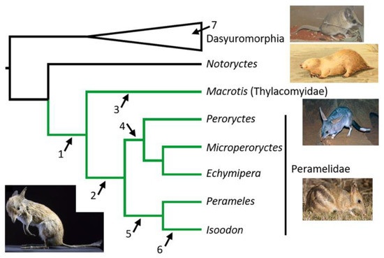 Peramelemorphia phylogeny (in green) for all extant genera, with dasyuomorphian and Notoryctes outgroups. The potentially extinct Rhynchomeles may fall within Echymipera [16]. Placements of Chaeropus in molecular and combined molecular-morphological studies; 1. Westerman et al. [12,14], Kear et al. [17], Travouillon and Phillips [16], Beck et al. [18], 2. Meredith et al. [13], Travouillon et al. [20], 3. Travouillon and Phillips [16], 4. May-Collado et al. [15], 5,6. Travouillon et al. [6], 7. Upham et al. [19]. Note that alternative analyses in some studies favoured differing placements. Images: Left; Chaeropus yirratji (Muséum national d’histoire naturelle, Paris), Right, from the top; Sminthopsis crassicaudata (A Couch), Notoryctes typhlops (R Lydekker), Macrotis lagotis (B Dupont), Perameles gunnii (JJ Harrison).