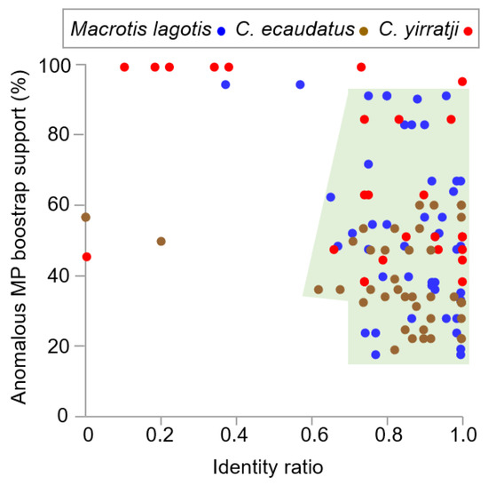 Scatterplot of the identity ratio from 150 bp BLAST windows versus highest anomalous MP bootstrap support among 300 bp MP windows that fully include that BLAST window, for Macrotis lagotis (blue), C. ecaudatus (brown) and C. yirratji (red). All BLAST windows are included from 12S/16S rRNA and Cytb. In the MP bootstrap analyses, the Cytb 3rd codon positions were RY coded. The shaded area covers 95% of Macrotis and 95% of C. ecaudatus windows. Identity ratio is a metric for the specificity of the identity to the top hit (IA) relative to the identity for the next most similar peramelemorphian genus (IB). Identity ratio = (1 − IA)/(1 − IB). Anomalous MP bootstrap support is whichever is the higher discrepancy with prior expectations, the support for the focal taxon either being excluded from other peramelemorphians and Notoryctes or being a shallow-level sister group with or within another genus. Scores on these metrics for each window are provided in Tables S3 and S4.