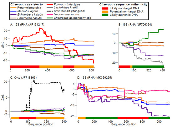 Cumulative lnL differences along gene sequences, for alternative sister group relationships for the published Chaeropus yirratji sequences, (A) 12S rRNA (AF131247), (B) 16S rRNA (JF706364), (C) Cytb (JF718363) and the published Chaeropus ecaudatus sequence, (D) 16S rRNA (MK359295 and MK359296 are identical). In each case, the null (zero ΔlnL) is for the focal Chaeropus sequence as sister to Peramelidae. Inferences of the authenticity of these sequences are indicated above the x-axes, as likely non-target DNA (red), potential non-target DNA (orange) or likely authentic DNA (green), based primarily on sliding window BLAST and MP bootstrap with densely sampled marsupial alignments (see Tables S3 and S4).