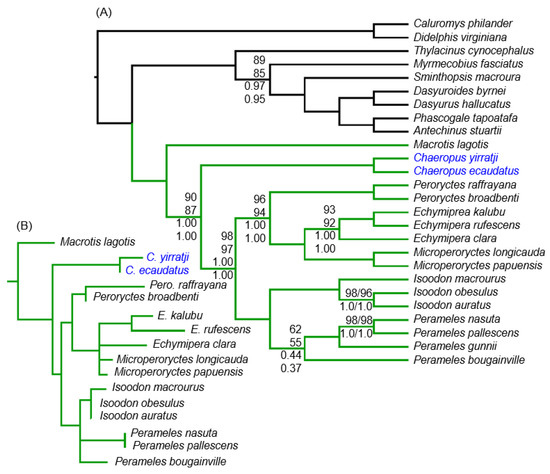 - Meredith, R.W.; Westerman, M.; Springer, M.S. A timescale and phylogeny for “bandicoots” (Peramelemorphia: Marsupialia) based on sequences for five nuclear genes. Mol. Phylogenet. Evol. 2008, 47, 1–20. [Google Scholar] [CrossRef]