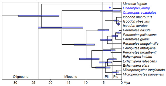 Molecular dated evolutionary timescale for peramelemorphian evolution, inferred in BEAST on the MtNuc26 data matrix with Cytb 3rd codon positions RY coded. Blue bars show 95% highest posterior density for node ages. The asterisk indicates the approximate age of Chaeropus baynesi from the Fisherman’s Cliff Local Fauna. Outgroup taxa and divergence times are provided in the Supplementary Information. Abbreviations: Pli; Pliocene, Ple; Pleistocene.