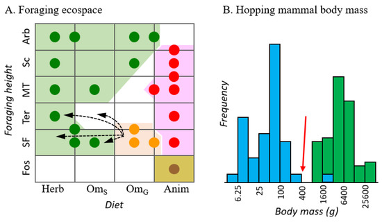 Three of the four possible foraging ecospace placements for Chaeropus in Figure 6A (into green patches) would represent an incursion across the ESND between bandicoots and diprotodontians, albeit into new (grassland) ecospace. Two aspects of the biology of Chaeropus and potential competition with macropods may be relevant: (1) In the ancestors of pig-footed bandicoots, small size near the energetic feasibility limit for a grazer may shift the balance of selection pressure in favour of gracile, ungulate-like legs for energetically efficient cursorial locomotion over selection for mechanical advantage in digging. The smallest predominantly grass-feeding macropods (see [62]), such as the rufus hare-wallaby (Lagorchestes hirsutus) are larger, averaging ~1.3 kg. (2) The mass of the quadrupedal Chaeropus falls in the trough of the binomial body mass distribution for mammalian hoppers (Figure 6B). Hopping appears to be most advantageous for predator avoidance at small body sizes [63] and imparts energetic advantages principally at larger sizes [64]. Moreover, macropod locomotion tends to be inefficient at low speeds [65]. Thus, an ecological opportunity for a small grazer feeding more or less constantly across the landscape rather than between more distant patches might be more accessible for a bandicoot evolving specialized quadrupedal locomotion than for further shrinking a macropod.