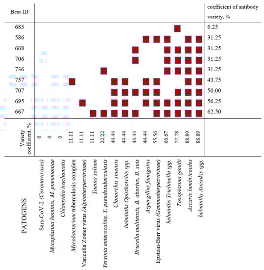 To estimate the diversity of detected antibodies in a bear, we introduced the coefficient of antibody variety — the percentage of tested pathogen-specific antibodies found in a certain animal.