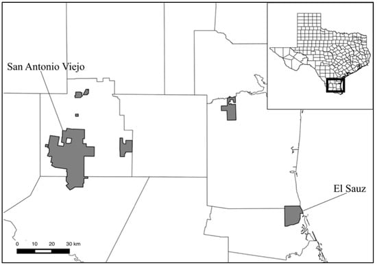 Map of Texas showing locations of East Foundation Properties. El Sauz and San Antonio Viejo ranches were utilized in this study from 2013 to 2015. For further reference, the El Sauz headquarters is located at 26.537 latitude, −97.448 longitude. The San Antonio Viejo headquarters is located at 26.955 latitude, −98.834 longitude.