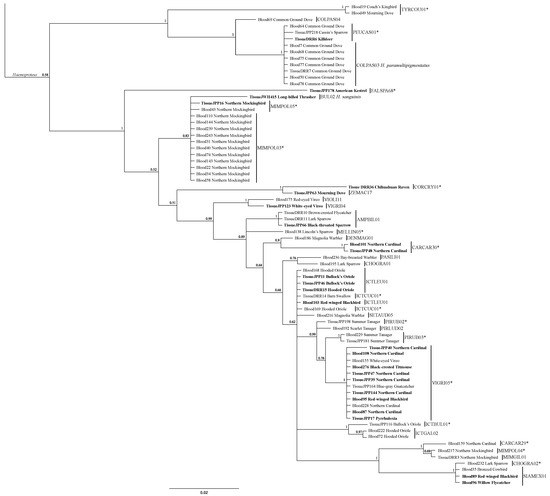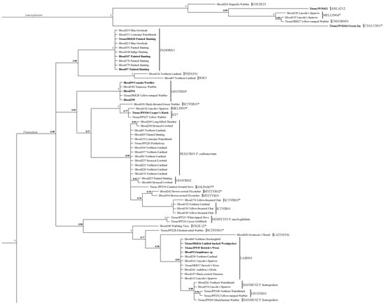 Each sequence was compared to published sequences located on GenBank (https://www.ncbi.nlm.nih.gov/genbank, accessed on 15 January 2019) using the NCBI Basic Local Alignment Search Tool (BLAST), and MalAvi (http://mbio-serv2.mbioekol.lu.se/Malavi/, accessed on 23 January 2019) [27]. Sequences which corresponded to known lineages (100% BLAST match) were labeled as that lineage. Following guidelines from Outlaw and Ricklefs [28], sequences with 99% similarity (1% dissimilar) or 1 fixed difference were assigned a new “tag” (i.e., lineage name).