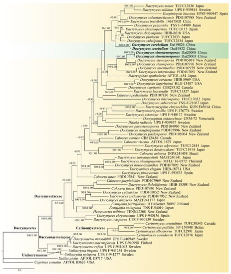 | Dacrymyces sinostenosporus | China | Dai 20008 | MW540889 | MW540891 |