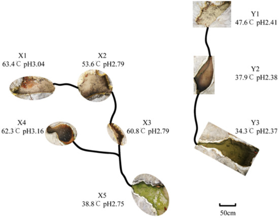 Two types of streams with low water flow and slow speed were selected. For stream X, samples were collected from the branches and confluence, while for stream Y, samples were collected upstream and downstream. Temperature and pH ranged from 38.3 to 63.4 °C and 2.75 to 3.16 in stream X and 34.3 to 47.6 °C and 2.37 to 2.41 in stream Y, respectively (Figure 1). These findings indicate that regardless of temperature or pH, the fluctuation in the X stream was more remarkable than that in the Y stream. As the water flowed, the temperature decreased, and the color of the sediments gradually turned to green.