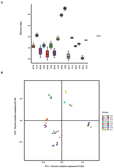 The alpha diversity based on the Shannon index for each sample and the beta diversity based on weighted UniFrac distances were calculated via QIIME (V1.9.1) and displayed with R software (V2.15.3) [20]. Principal coordinate analysis (PCoA) was performed to obtain principal coordinates and to visualize the complex; these findings were displayed by using QIIME (V1.9.1) and the ggplot2 package in R software. Redundancy analysis (RDA) and parameter correlation were carried out using the R programming language [20] and the Vegan package [21].