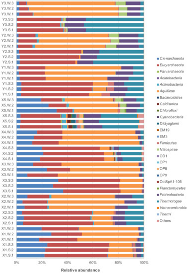 Species annotation showed that bacterial OTUs (81.87%) were dominant and that archaeal OTUs accounted for 17.95% of the total. The relative abundances at the phylum level of all 48 samples are shown in Figure 4. The taxonomic compositions of the three biological replicates for each type of sample at each site were relatively close. Furthermore, the OTU annotation numbers for the three biological replicates from kingdom to genus were quite consistent (Supplementary Materials Figure S1). A total of 25 phyla were annotated, among which the names of 3 archaeal phyla and 15 bacterial phyla were determined. Euryarchaeota, Crenarchaeota, Aquificae, Thermotogae and Proteobacteria were the dominant phyla with relative abundances above 5%, accounting for 95.31% of the total prokaryotes. Aquificae dominated in the water samples, while Euryarchaeota dominated in most sediment samples.