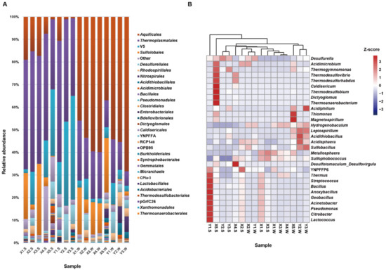 The OTUs were distributed among three archaeal phyla, Euryarchaeota (5.39–54.98%), Crenarchaeota (0.41–36.58%) and Parvarchaeota across all the samples (Figure 4). Except for the water samples at confluence site X5, the relative abundances of Euryarchaeota were higher than those of Crenarchaeota, with average values of 31.9% and 11.1%, respectively. At the order level, there were five orders, with the most abundant belonging to Thermoplasmatales (up to 53.64%) in the sediment sample upstream of stream Y and Sulfolobales (0.011–20.798%) across all samples (Figure 5A). There were 28 families belonging to three archaeal phyla, and the most abundant families were Sulfolobaceae (mean 8.71%), A10 (mean 24.90%) and BSLdp215 (Supplementary Materials Table S2). Interestingly, the relative abundance of family A10 in all the sediments was higher than the mean value. In contrast, in family BSLdp215, only four sediment groups (X2, X5, Y1 and Y2) and one water group Y1 had higher relative abundances than the mean value. These two families belonged to Thermoplasmatales. In Figure 5B, the top 30 genera were illustrated in a heatmap, and three were archaeal genera, namely, Metallosphaera, Thermogymnomonas and Sulfophobococcus.