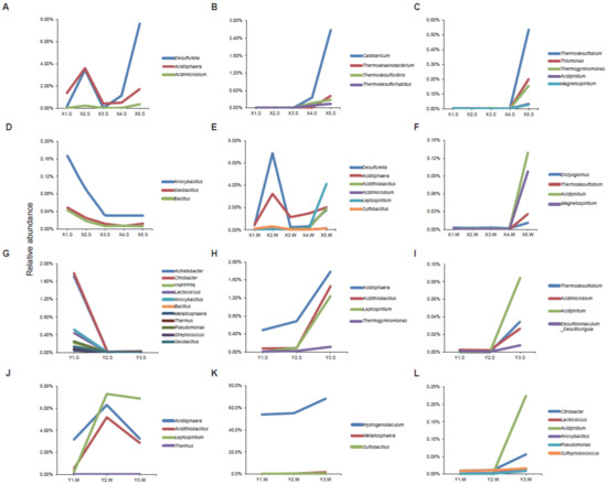 According to the top 30 genera with the highest abundance, clustering of the samples was performed at different locations in the two streams. Each group, including more than three species, was selected and is shown in Figure 7. In stream X, there were four groups for the sediment sample and only two groups for the water sample, while in stream Y, there were three groups in either water or sediment samples. The greatest number of species that clustered to form the trend were found in the sediment samples in stream Y, while in stream X, the sediment and water groups had similar numbers of clustered species. Along the direction of the flow in stream X, the relative abundances of Desulfurella, Acidisphaera and Acidimicrobium exhibited similar trends, namely, increase-decrease-increase-increase, in water or sediment (Figure 7A,E). The relative abundances of Thermodesulfobium and Acidiphilium remained unchanged at the four stream sites in the upper and middle of stream X (Figure 7C,F). After the two branches merged, the relative abundances of Caldisericum, Thermoanaerobacterium, Thermodesulfovibrio and Thermodesulforhabdus increased in the sediment (Figure 7B). This indicates that these four genera were mainly from tributary X4. In stream Y, along the flow of the water, the largest cluster included 11 genera, which decreased at midstream and remained constant downstream (Figure 7G). Figure 7J shows that Acidisphaera, Acidithiobacillus, Leptospirillum and Thermus increased at midstream and decreased downstream, similar to the water or sediment samples of the stream X primary current (X1 to X3).