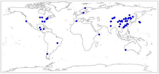 Global distribution of sites included in this study. The blue points represent each data sampling site around the world.