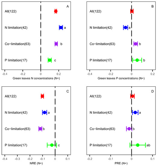 The meta-analysis was conducted using “metacont” and “forest” functions in the R package “meta” (https://cran.r-project.org/web/packages/meta/index.html (accessed on 20 February 2022)). Because of the non-Gaussian distribution of the effect sizes, we used nonparametric approaches to test the hypothesis that the mean effect size is not equal to zero (that is, loge(1/1)). We bootstrapped 95% confidence intervals by sampling from the distribution of response ratios 10,000 times with replacements and taking the 2.5th and 97.5th quantiles of the bootstrapped distribution. The fertilization effect was considered to be significant if the 95% confidence interval (CI) of RR++ did not overlap with zero [61]. To quantify the importance of different predictors in determining the response of leaf nutrient concentrations and NuRE to fertilization, we also used the machine learning technique ‘random forests’. We generated 10,000 regression ‘trees’ each recursively portioning the observation into groups, using the “gbm” function in the R package “gbm” (https://cran.r-project.org/web/packages/gbm/index.html (accessed on 20 April 2022)). After the analyses, among the potential influencing factors, including categorical factors (ecosystem type, plant growth type, fertilization types, climate zone and different nutrient-limited conditions) and continuous factors (experimental duration, fertilization application rate, MAT and MAP), we found that the most important influencing factor was the plant nutrient-limited condition (see Figures S3 and S4). Therefore, in this study, we focused on exploring how leaf N or P concentrations and NRE or PRE responded to fertilization under different nutrient-limited conditions. The mean RR++s were then compared under different nutrient-limited conditions using an approach analogous to one-way weighted ANOVA.