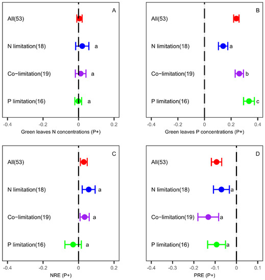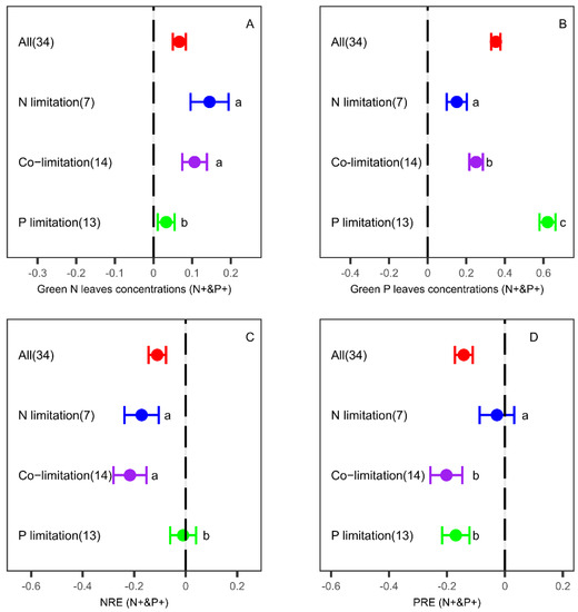 Responses of leaf nitrogen (A) and phosphorus (B) concentrations, nitrogen resorption efficiency (NRE) (C) and phosphorus resorption efficiency (PRE) (D) to N fertilization (N+). Error bars are the 95% confidence intervals of the mean. Different letters indicate the significant differences among different nutrient limitations under N fertilization. The red (bule, purple and green) points represent leaf N (P/NRE/PRE) in general, under N limitation, co-limitation and P limitation, respectively.
