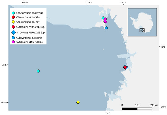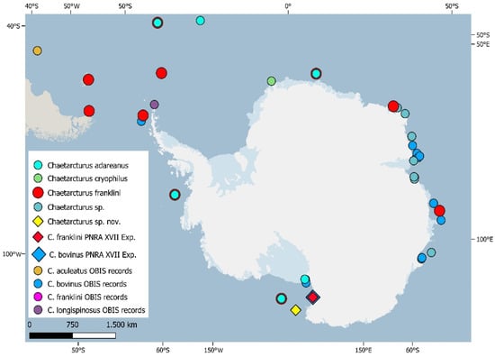 Additional Chaetarcturus species distribution data [1,4,5,6,7,8,9,10,11,12,13,14,15,16,17,18,19,20,21,22,23,24,25] were provided through GBIF (Global Biodiversity Information Facility, available from https://www.gbif.org/ accessed on 1 January 2021) and OBIS (Ocean Biodiversity Information System https://obis.org/ accessed on 1 January 2021). Quality check and data cleaning were performed using bibliographic research and rgbif package (https://CRAN.R-project.org/package=rgbif accessed on 1 January 2021) in RStudio software. Maps were drawn using QGIS (QGIS.org 2021 accessed on 1 January 2021) package QAntarctica [26].