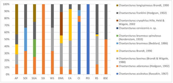 Using OBIS and GBIF data, in addition to MNA samples dataset, a Chaetarcturus presence-absence table was created (Table 1). Areas in this study are AP (Antarctic Peninsula), SOI (South Orkney Islands), SGA (South Georgia Area), SSI (South Sandwich Islands), WS (Weddell Sea), DML (Dronning Maud Land), EA (East Antarctica), CI (Crozet Islands), PEI (Prince Edward Islands), RS (Ross Sea), BSE (Bellingshausen Sea East). Red “x” indicates new records, based to the study of MNA samples. New records, regarding Ross Sea (RS) area, are Chaetarcturus bovinus (Brandt & Wägele, 1988), and Chaetarcturus cervicornis sp. n. (species new to science). Then percentage of individuals counted in MNA, OBIS and GBIF datasets was calculated (Figure 3): in AP 42.86% C. longispinosus Brandt, 1990, 14.29% C. franklini (Hodgson, 1902), Chaetarcturus Brandt, 1990 (ND), C. bovinus, and C. adareanus (Hodgson, 1902); in SOI 33.33% C. adareanus, C. brunneus (Beddard, 1886), and C. franklini (Hodgson, 1902); in SGA 25% C. longispinosus, C. franklini, C. brunneus spinulosus (Nordenstam, 1933), and C. adareanus; only C. adareanus present in SSI; in WS 33.33% C. adareanus, C. bovinus, and C. franklini; in DML 11.11% Chaetarcturus (ND), C. adareanus, and C. franklini, 33.33% C. bovinus, and C. cryophilus Hille, Held & Wägele, 2002; in EA 6.90% C. adareanus, and C. franklini, 41.38% C. bovinus, 44.83% Chaetarcturus (ND); in CI 8.33% C. adareanus, C. brunneus, and C. franklini, 75% C. aculeatus (Kussakin, 1967); only C. aculeatus is present in PEI; in RS 14.29% C. adareanus, 40.26% C. bovinus, 41.56% C. franklini, 2.60% Chaetarcturus (ND), and 1.30% C. cervicornis sp. n.; in BSE 50% C. adareanus and C. franklini.