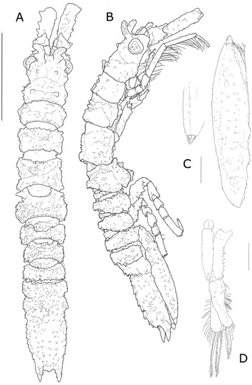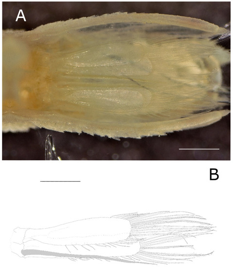 Pleotelson covered with spiny tubercles. Caudal part of pleotelson with two long and stout spines approximately one third and half of length of pleotelson, which surpasses uropods (Figure 4A,B). Dorsal pleotelsonic surface covered with small spines (Figure 4A).