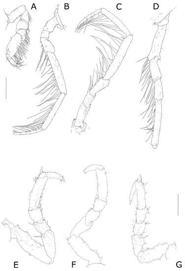 Chaetarcturus cervicornis sp. n., male holotype (MNA 10739) (A) left first pereopod (B) second pereopod (C) left third pereopod (D) left fourth pereopod (broken) (E) left fifth pereopod (F) right sixth pereopod (G) right seventh pereopod. All scale bars = 1 mm.