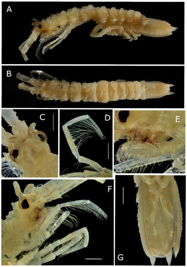 Chaetarcturus cervicornis sp. n., male holotype (MNA 10739) stack photos (A) lateral view (B) dorsal view (C) dorsal side of cephalothorax, where supraocular spines and the two pairs of blunt tubercle-like spines are evident (D) third pereopod (E) first pereopod (F) lateral side of cephalothorax, focus on second pereopod (G) ventral side of the pleotelson, focus on pleopods. Scale bar = 1 mm except in (E) where scale bar = 0.5 mm.
