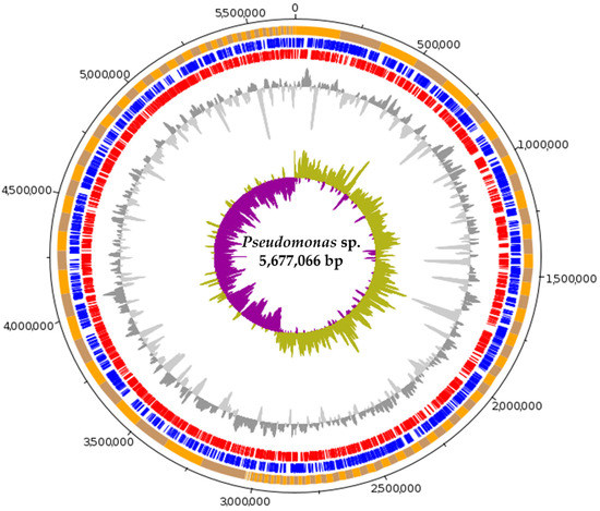 Considering the high level of completeness (99.38%) and a contamination percentage close to zero (0.1%), was reported here, a high-quality genome draft [59] of Pseudomonas sp. strain C3, which contains 5,677,066 bp, with a GC content of 61.37% (Figure 1). Similar results have been obtained by other researchers who sequenced Pseudomonas wadenswilerensis isolated from forest soils in 2014, achieving a high-quality draft of 5,966,942 bp with a GC content of 63.39% [60], while Pseudomonas aeruginosa isolated from a polluted industrial metalworking environment has also been drafted in high quality, yielding a genome 6,985,358 bp in length and with a GC content of 66.08% [61].