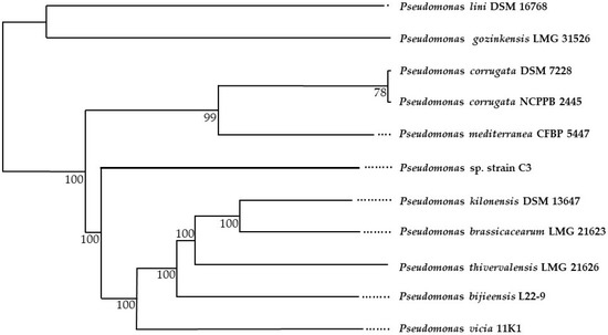 Taxonomic identification based on the complete genome of Pseudomonas sp. strain C3 yielded 10 species grouped from other Pseudomonas genera, among which five (in addition to Pseudomonas sp. strain C3) formed a single paraphyletic clade (Figure 2). This phylogenetic tree was constructed based on the results obtained from the dDDH values of our strain (query strain) with each subject strain and its corresponding confidence interval (C.I., Table S1).