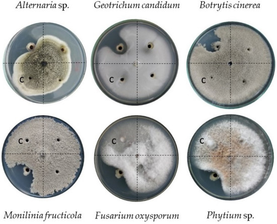 The antagonism assay was performed according to the method described by Sepúlveda-Chavera et al. [51] Briefly, potato dextrose agar (PDA) plates were inoculated with the plant pathogenic fungi Botrytis cinerea, Monilinia fructicola, Phytium sp., Alternaria sp., Geotrichum candidum, and Fusarium oxysporum in the center of each plate, and 20 µL of Pseudomonas sp. strain C3 culture in a stationary phase at 2.5 cm from the center of the Petri dish culture. Plates only inoculated with fungi in the center were used as a control.