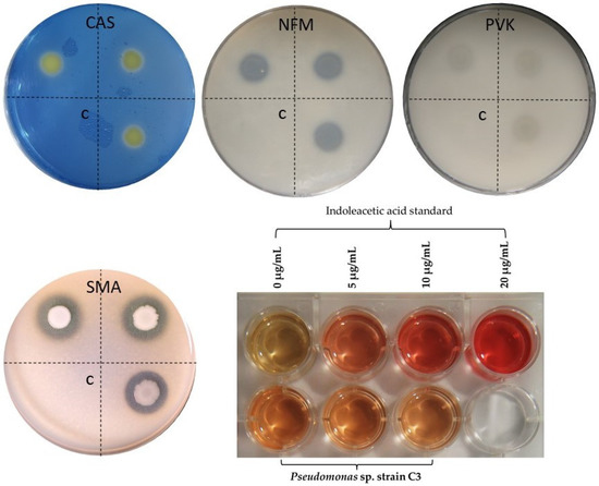 Through in vitro assays (Figure 6), four positive PGP activities were confirmed in Pseudomonas sp. strain C3, such as siderophore production (using CAS agar medium), nitrogen fixation (NFM culture medium), phosphate solubilization (PVK culture medium), and IAA production (Salkowski test). Complementary to this, hydrolase activity was also detected, specifically for proteases through the SMA medium culture.