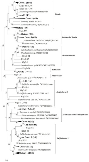 Genotypes K1g5-34 (KF537711) and K1g5-39 (KF537714) within the genus Loktanella together comprised 19.2% and 30.6% of the St1 and St5 clones, respectively. They show higher than 98% g5 gene product amino acid similarity to strain Loktanella salsilacus (WP090187762). Members of Loktanella can participate in DMSP degradation and aerobic anoxygenic photosynthesis in polar marine environments [19,20]. Except for group All1 (Figure 2) containing genotypes shared by the outer and inner stations, sequences within the Loktanella/Yoonia and Yoonia phylogenetic groups were exclusively detected at outer station St1, together accounting for 15.8% of the St1 clones. The genus Yoonia contains many species (e.g., Loktanella litorea, Loktanella vestfoldensis and Roseobacter sp. CCS2) formerly classified within the genera Loktanella and Roseobacter [33]. These Yoonia species have also been found to possess the aerobic anoxygenic phototrophy gene pufM and DMSP degradation genes [19,20,32]. Most species of Yoonia require NaCl to grow, indicating that Yoonia-related sequences detected in this study originated from marine environments.