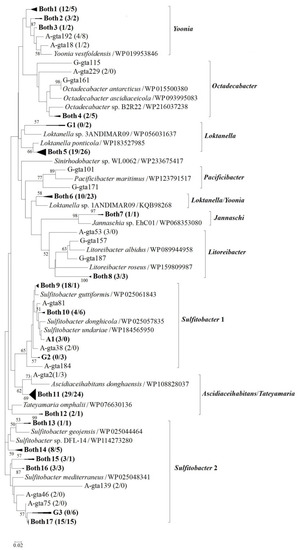 - Liang, K.Y.H.; Orata, F.D.; Boucher, Y.F.; Case, R.J. Roseobacters in a sea of poly- and paraphyly: Whole genome-based taxonomy of the family Rhodobacteraceae and the proposal for the split of the“Roseobacter clade” into a novel family, Roseobacteraceae fam. nov. Front. Microbiol. 2021, 12, 683109. [Google Scholar] [CrossRef]