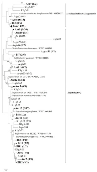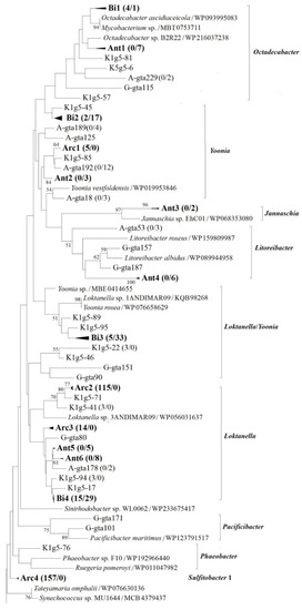 Represented by genotype K1g5-34 (KF537711) showing identical to Loktanella salsilacus (WP 090187762), which was first isolated from an Antarctic salt lake [41], phylogenetic group Arc2 comprised 29.6% of Arctic clones but was not detected in Antarctic samples. In addition, represented by genotypes A-gta166 (KF686615) and A-gta221 (KF686666) showing higher than 93% similarity to Loktanella ponticola (WP183527985), groups Ant5 and Ant6 were exclusively observed in Antarctic samples and accounted for 4.1% of the total Antarctic clones. However, the type strain of Loktanella ponticola was isolated from seawater in the Korean South Sea [44]. Therefore, Loktanella-related genotypes within the phylogenetic groups Arc2, Ant5 and Ant6 can actually be considered to have a bipolar distribution.