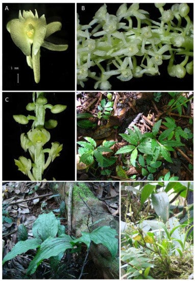 - Zhou, X.; Cheng, Z.; Liu, Q.; Zhang, J.; Hu, A.; Huang, M.; Hu, C.; Tian, H. An updated checklist of Orchidaceae for China, with two new national records. Phytotaxa 2016, 276, 1–148. [Google Scholar] [CrossRef]