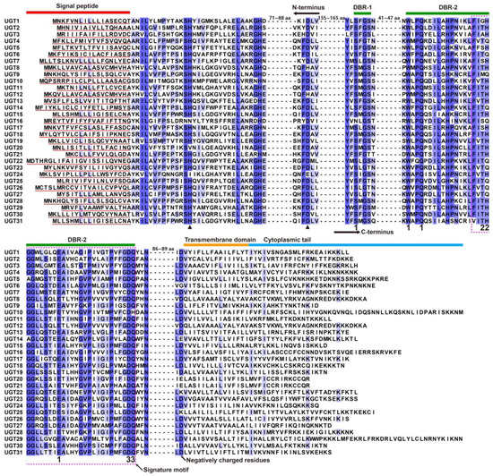 Multiple alignment of amino acid sequences of 31 full-length UGTs in A. yunnanensis. The signal peptide, N–terminus, C–terminus, donor binding regions (DBR–1 and DBR–2), a transmembrane domain, and a cytoplasmic tail are marked on the top of the alignment. Triangles represent two catalytic residues. The signature motif is indicated by a magenta dotted box. Numbers 1, 2, and 3 represent amino acids interacting with nucleotides, phosphates and glucosides, respectively.
