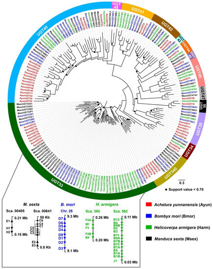 The evolutionary adaptation of insects to habitats is associated with various biotransformation processes, especially for the detoxification pathway that is indispensable for herbivorous insects to detoxify the toxic chemicals derived from their food host plants or the external environment. Usually, these detoxification-related enzymes mainly refer to the phase I (cytochrome P450 monooxygenases, P450s, and carboxylesterases, COEs) and II (glutathione S-transferases, GSTs, and uridine diphosphate (UDP)-glycosyltransferases, UGTs), which are of utmost importance for the survival and reproduction of insects. The phytophagous insects utilize these enzymes to metabolize xenobiotics and endobiotics, which are often toxic to herbivores [1,2]. In comparison to the three superfamilies of P450s, GSTs, and COEs, UGTs in insects have received relatively little attention. As one of the most important detoxification enzymes, insect UGTs have been demonstrated to be mainly responsible for the metabolism of plant allelochemicals and insecticides [3,4,5].