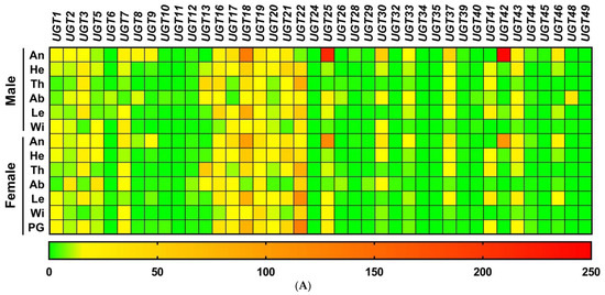 As 10 transcripts encoding UGTs were identified exclusively from the initially assembled transcripts which were not clustered by Corset v1.05 [36], their FPKM values were unable to be calculated in various tissues. Thus, we constructed an expression profiling map of 40 AyunUGTs in 13 tissues. The majority of the genes were widely transcribed in tissues, such as AyunUGT1–3/5/7/16–22/25. Focusing on the genes specifically or highly expressed in tissues, it was found that six AyunUGTs had an antenna-enriched expression, including AyunUGT8/9/18/25/30/37/42/46 where AyunUGT8 appeared to be a male-biased relative in the antennae with a 5.12-fold difference compared to females. In contrast, AyunUGT22 expression was female-antenna-predominant. In addition, AyunUGT5, UGT41, and UGT48 were abundantly expressed in female abdomens, legs of both sexes, and male abdomens, respectively (Figure 3A).