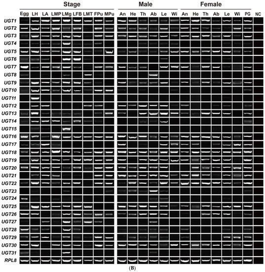 To reconstruct and investigate the expression of 31 AyunUGTs with full-length sequences, nine additional tissues from different developmental stages were selected, including three detoxification-related tissues of larvae (midguts, fat bodies, and Malpighian tubules). Consistent with the results by RNA sequencing (RNA-Seq), most of the genes displayed a broad tissue expression. Intriguingly, the transcription of two genes was restricted to larval heads (AyunUGT11) and larval midguts (AyunUGT15). Some genes appeared to have a dominant expression in tissues, for example, AyunUGT4 and UGT31 expressed in larval midguts, AyunUGT6 expressed in larval midguts and fat bodies, and AyunUGT23 expressed in male abdomens. Out of the 31 AyunUGTs, 24 and 22 relatives were detected in antennae and maxillary palps of the larval stage, respectively, while 20 and 18 genes were presented separately in male and female antennae. In three main detoxification tissues, a number of AyunUGTs were found to have the expression in larval midguts, fat bodies, and Malpighian tubules with 26, 22, and 19 relatives, respectively (Figure 3B).