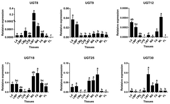 qPCR analysis of six candidate UGT genes in A. yunnanensis. Data denote mean ± standard errors. Different lowercases above bars represent significant differences among tissues (p < 0.05, ANOVA, LSD). LA, larval antennae; LFB, larval fat bodies; LMP, larval maxillary palps; LMg, larval midguts; LMT, larval Malpighian tubules; MA, male antennae; ML, male legs; FA, female antennae; FL, female legs.
