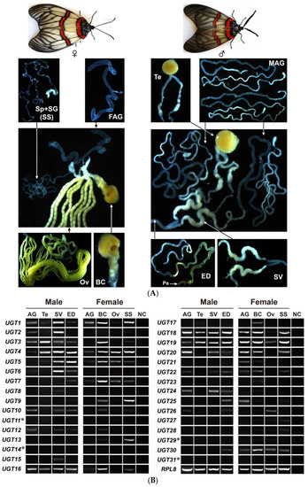 Expression profile of 31 full-length UGT genes in reproductive tissues of A. yunnanensis. (A) Reproductive systems of female and male moths. (B) Expression of UGT genes in eight reproductive tissues. Asterisks mean that the transcription of the genes was not detected in tissues. MAG, male accessory glands; Te, testes; SV, seminal vesicles; ED, ejaculatory ducts; FAG, female accessory glands; BC, bursa copulatrix; Ov, ovaries; and SS, spermathecae with spermathecal glands.