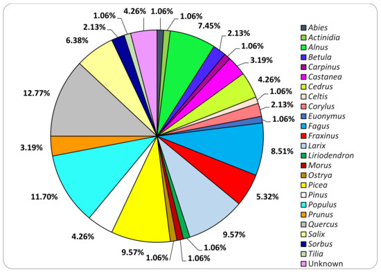 In total, 26 genera of trees on which the fungal species were growing could be identified (Figure 3). In particular, the majority of the collected basidiomata were growing on Quercus spp. (12%).
