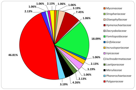 The family of Polyporaceae is the most represented in the collection: almost 50% of the isolated species belong to it (Figure 4). For orders, Polyporales is by far the most represented: 55.6% of the isolated families belong to it (Figure 5).