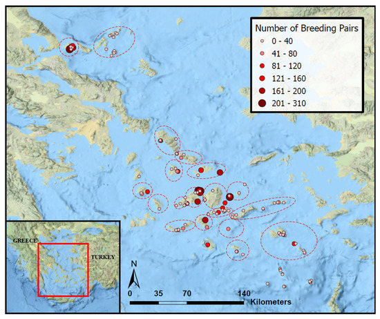 Locations and sizes (number of breeding pairs) of sampled L. michahellis colony sites located in the Aegean Sea. Regional boundaries are shown with dashed red lines and have been simplified for effective viewing. Base map sources: Esri, USGS, HERE, Garmin, FAO, NOAA, CGIAR.