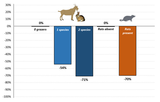 The data here argue for effects through direct nest disturbance as nesting density was not significantly related to the extent of perennial vegetation cover. Field observations indicate that Yellow-legged Gulls prefer the presence of shade for breeding; hence, more research is needed to ascertain the relative importance of the two mechanisms. As shown in Figure 3, the presence of a single grazing species (either rabbits or goats) reduces the baseline density of a colony by about 54%. The addition of a second grazing species further reduces the density of a colony to about 71% below the model baseline, indicating an additive effect of non-native grazer presence. The reduction in gull numbers by grazers is likely ecologically significant for the region [60], and grazing was extensive throughout the study area, with 55% of sampled islets containing at least one grazing species, and 17% containing two. Seabird presence and guano deposits on land are often depended upon for the recovery of overgrazed areas [61]. A decrease in seabird numbers likely lessens the chance of ecological recovery of endemic plant communities after the grazing species are moved or eradicated. Our results indicate an urgent need for policy prohibiting grazer releases to be put in place to avoid further reductions in seabird nesting, as well as the eradication of feral grazing individuals from small islets to restore potential nesting habitats.