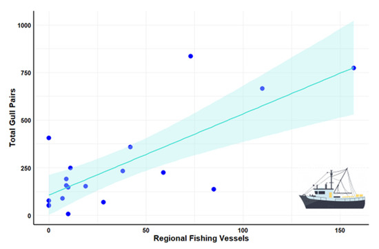 Because of the feeding ecology of Yellow-legged Gulls, it is important to examine not only colony-specific factors but also regional variables impacting multiple colonies at once. At the regional scale, the most significant factor impacting aggregate gull population size was the number of registered fishing vessels in that region (Figure 4). The presence of fishing vessels acts as an abundant, predictable high-quality food source for gulls by providing bycatch and offal [62,65]. We found no evidence that the total islet area in a region is related to the number of breeding pairs. This result suggests that PAFS such as fishery discards may have a larger effect on colony size than habitat availability. Due to our low sample size of regions, we cannot definitively quantify this relationship and encourage future study.