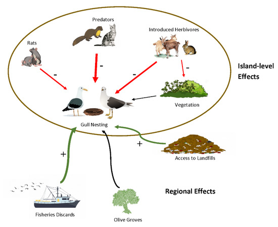 Conceptual diagram depicting functional interactions for a typical Larus michahellis colony in the Aegean Sea Region, including island-level and regional relationships with the potential to affect colony size and density. Red arrows represent expected negative effects, while green arrows suggest positive impacts.