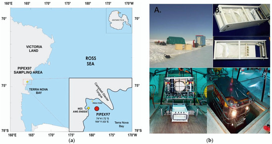 The field settings at the PIPEX 97 project sampling area, Terra Nova Bay, Antarctica, 1997. (a) The positions of the meteorological (ENEIDE) and the oceanographic (FRIDA) stations. (b) The biological station and the details inside the tent during field activities: (A) the sampling area on the pack-ice; (B) top view of the MicroNESS and position of the 4 sampling nets; (C) the attachment of MicroNESS to the ROMEO structure; (D) the deployment of the system through the hole in the ice.