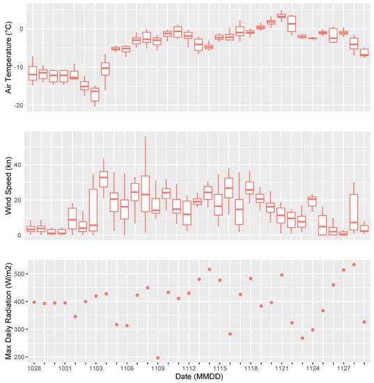 The meteorological data collected at ENEIDE in Terra Nova Bay from late October to late November 1997 are shown in Figure 2. The air temperature remained well below −10 °C until early November, when an episode of strong wind marked the beginning of spring, as indicated by the general increase in insolation maxima (up to 500 Wm−2) and daily average air temperatures (from −5.1 °C on Nov 5 to +3.4 °C on Nov 21). At the end of November, air temperature decreased abruptly, from daily averages of +1.2 °C (22 November) to below −5.0 °C (29 November).