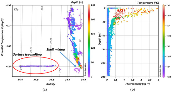 Polar shelf regions are important sites for water mass formation and transformation. Shelf seawater is strongly influenced by heat and evaporation fluxes between the ocean, the ice, the sea ice, and the atmosphere, as well as exchange with the open ocean. In the Ross Sea, circumpolar deep water (CDW) intrudes onto the shelf, undergoes mixing, and contributes to the transformation of the Ross Sea Shelf Water, characterised as T ≈ −2.0 °C and S = 34.4 to 34.8 [18,19]. During spring, close to the pack-ice borders, local mixing is enhanced by recurrent events of lateral advection of fresher water at the melting-point temperature due to the ongoing melting of the rear pack interacting with coastal recirculation and progressive seasonal surface warming [20,21]. Ross Sea Shelf Water is mainly formed during winter when there is large heat loss to the atmosphere. In the polynya areas, during sea ice freezing and rapid removal by katabatic winds, local brine rejection increases the salinity, producing a subsequent convective sinking that fills up deeper basins such as those near the Drygalski Ice Tongue [22,23].
