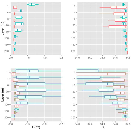 The output from the ROMS modelling is shown in the lower panels on the same figure (Figure 4, lower panels, T and S); to facilitate comparison, the values were binned into the same vertical depth strata used for the measured profiles. As expected, the variability in model output appears larger than (but consistent with) measured variability, since the modelled data integrated both the climatic fluctuations of 15 years and the spatial conditions of a 5 × 5 km2 cell. The variability was more pronounced in the second half of November for both T and S. In particular, within the 20 m thick uppermost layer and below 150 m depth, the modelled thermal structure reflected the trend shown in the PIPEX field data, while the intermediate layer (50–150 m) exhibited more dynamic behaviour. For salinity, during the first half of November, the observed ranges were well represented within the modelled variability, whereas in the second part of the month the uppermost layers appeared to be more dynamic and dominated by ice-related processes, leading to an excess of freshening.